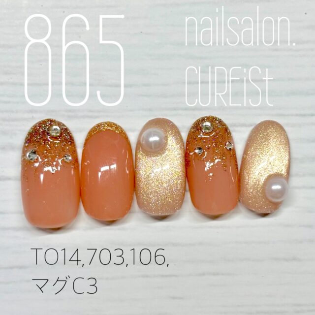 ジェルオフ⇒爪整形⇒甘皮処理⇒ベースジェル⇒アート⇒トップジェル⇒ハンドクリーム、ネイルオイル塗布